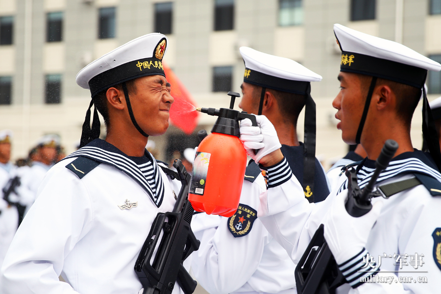 海军方队队员在训练间隙用喷壶解暑降温。高密 摄