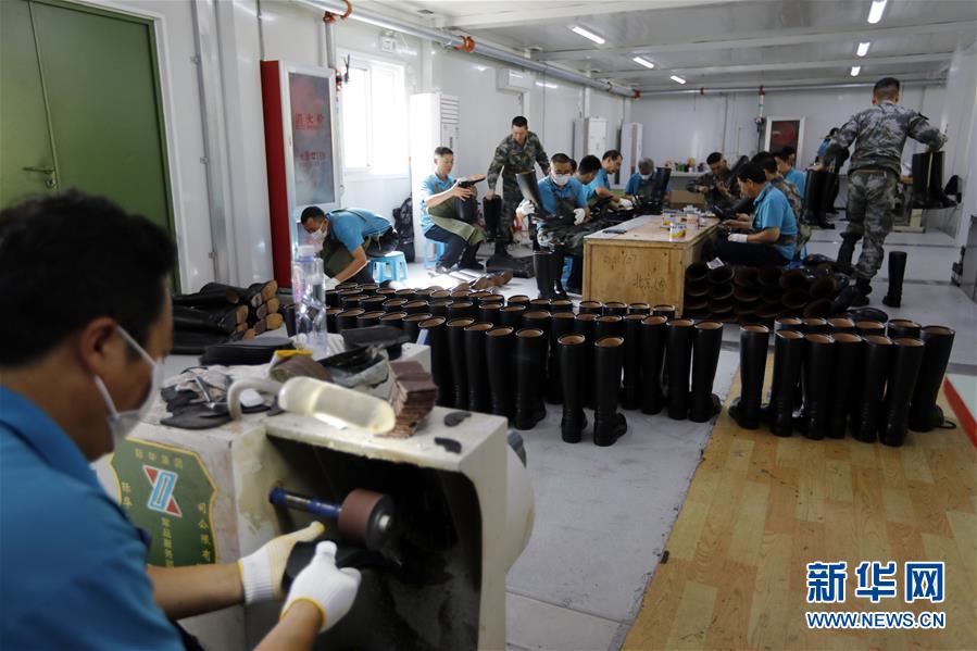 联勤保障兵站被装保障中心人员在修理受阅官兵送来的鞋靴(9月20日摄)。
