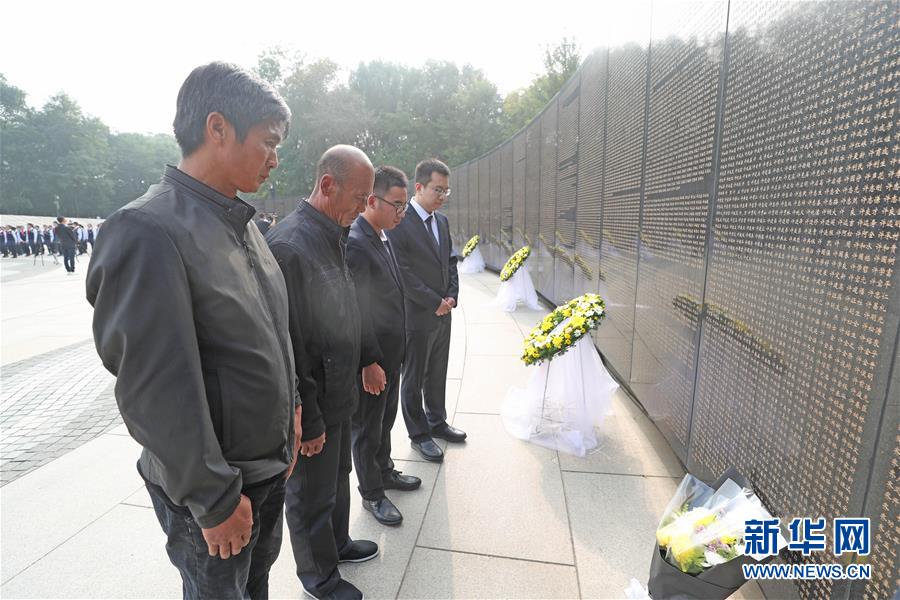 9月29日,许玉忠烈士家属在烈士英名墙上找到烈士名字并向亲人默哀。新华社记者 杨青 摄