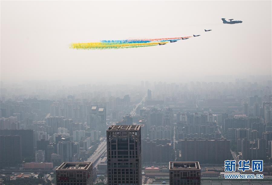 10月1日上午,庆祝中华人民共和国成立70周年大会在北京天安门广场隆重举行。 这是领队机梯队飞过北京上空。 新华社记者 肖艺九 摄
