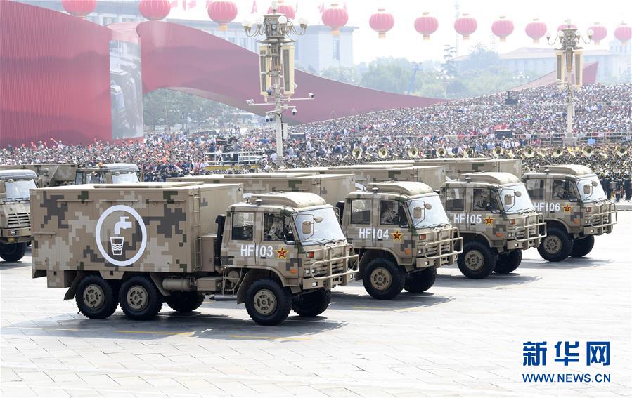 10月1日上午,庆祝中华人民共和国成立70周年大会在北京天安门广场隆重举行。这是补给供应方队接受检阅。 新华社记者 高洁 摄