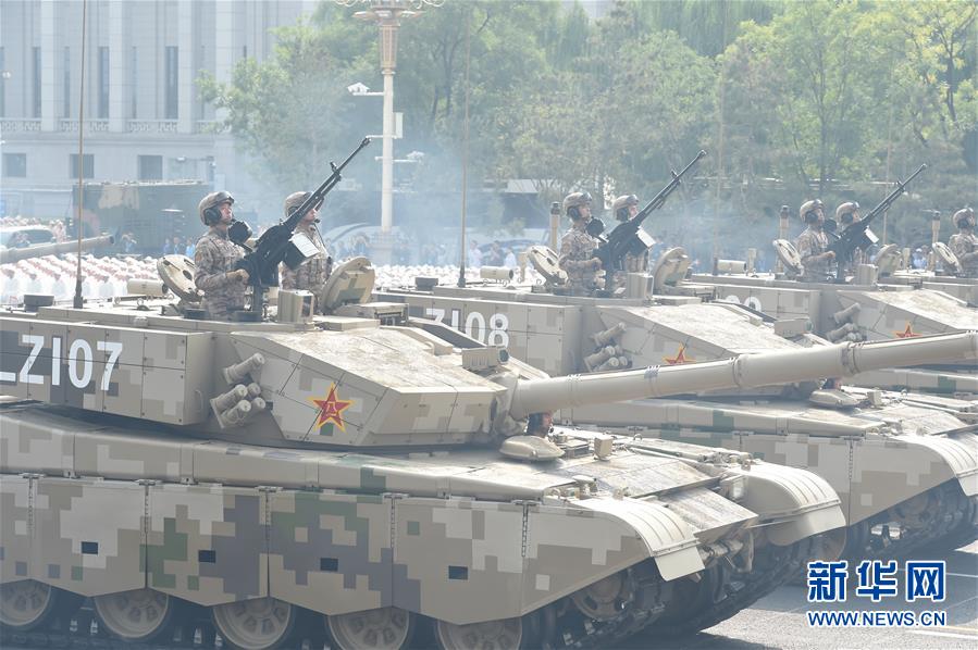10月1日上午,庆祝中华人民共和国成立70周年大会在北京天安门广场隆重举行。这是受阅的坦克方队。 新华社记者 张国俊 摄