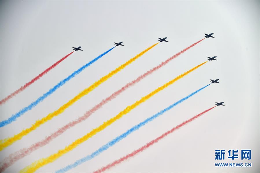 10月1日上午,庆祝中华人民共和国成立70周年大会在北京天安门广场隆重举行。这是教练机梯队。 新华社记者 李鑫 摄