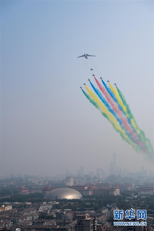 10月1日上午,庆祝中华人民共和国成立70周年大会在北京天安门广场隆重举行。这是领队机梯队。 新华社记者 刘金海 摄