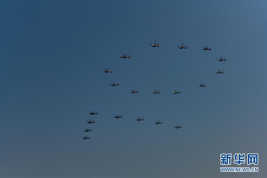 10月1日上午,庆祝中华人民共和国成立70周年大会在北京天安门广场隆重举行。 这是直升机在空中组成“70”字样。 新华社记者 刘金海 摄