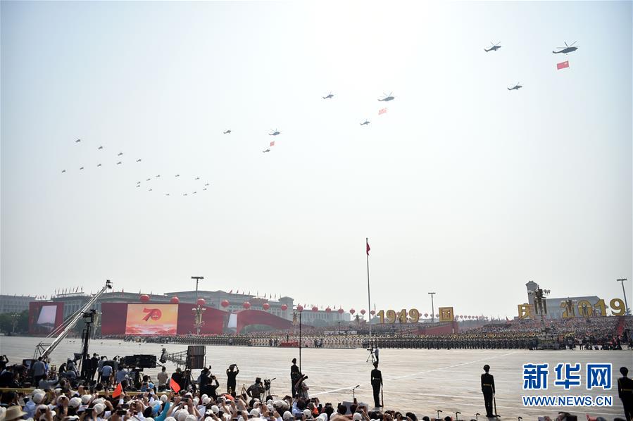 10月1日上午,庆祝中华人民共和国成立70周年大会在北京天安门广场隆重举行。这是空中护旗梯队。 新华社记者 刘续 摄