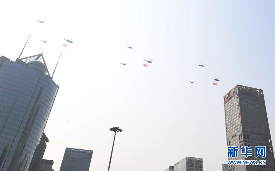 10月1日上午,庆祝中华人民共和国成立70周年大会在北京天安门广场隆重举行。这是空中护旗梯队。 新华社记者 邓华 摄