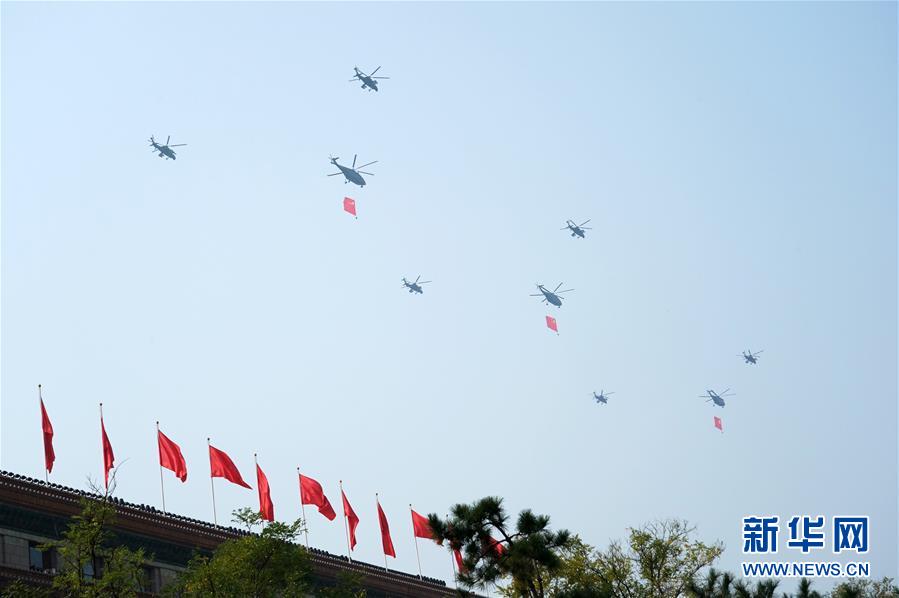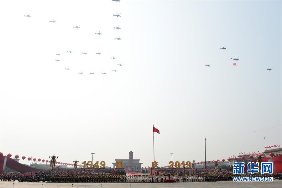 10月1日上午,庆祝中华人民共和国成立70周年大会在北京天安门广场隆重举行。这是空中护旗梯队飞过天安门广场上空。 新华社记者 刘大伟 摄