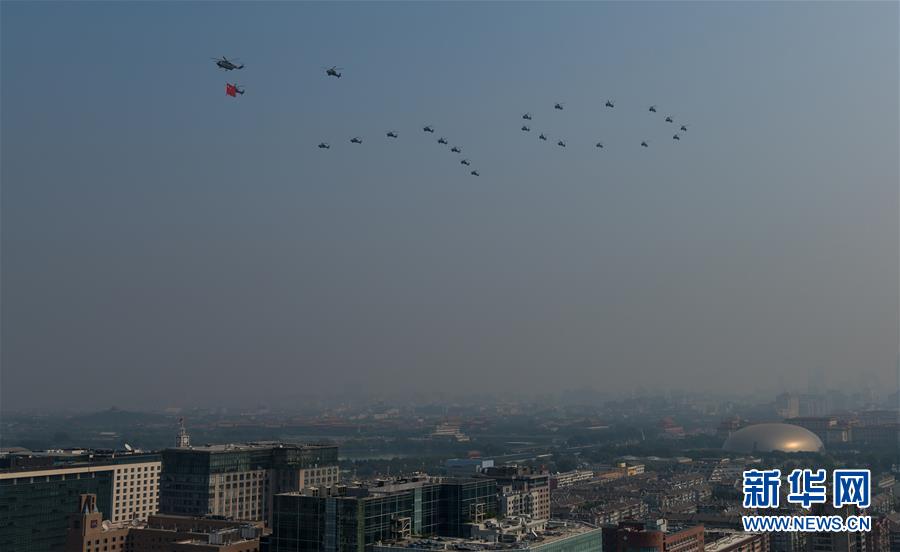 10月1日上午,庆祝中华人民共和国成立70周年大会在北京天安门广场隆重举行。这是直升机在空中组成“70”字样。 新华社记者 刘金海 摄