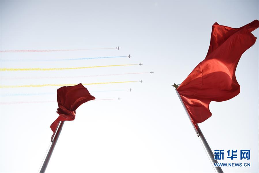 10月1日上午,庆祝中华人民共和国成立70周年大会在北京天安门广场隆重举行。 这是教练机梯队。 新华社记者 沙达提 摄