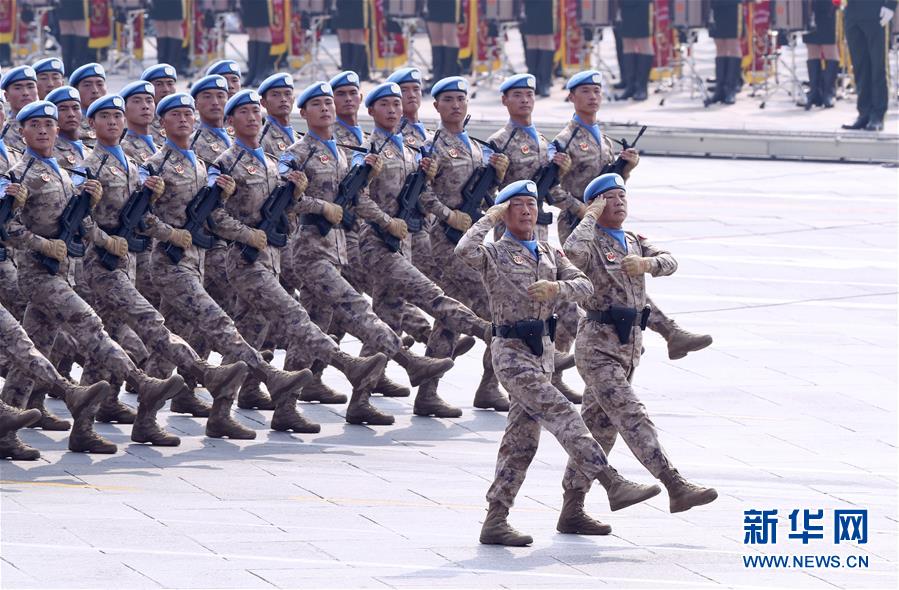 10月1日上午,庆祝中华人民共和国成立70周年大会在北京天安门广场隆重举行。这是维和部队方队接受检阅。 新华社记者 殷刚 摄