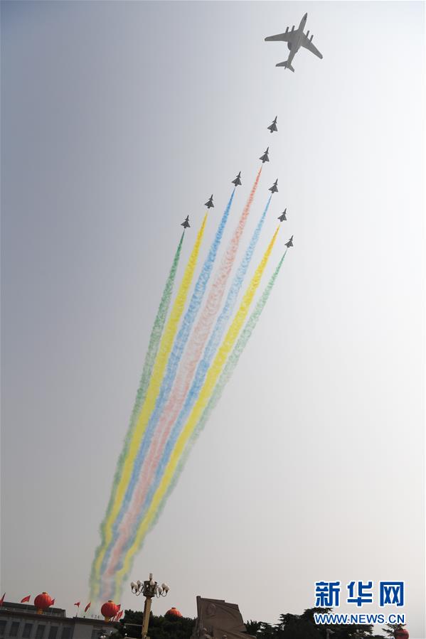 10月1日上午,庆祝中华人民共和国成立70周年大会在北京天安门广场隆重举行。 这是领队机梯队。 新华社记者 赵颖全 摄