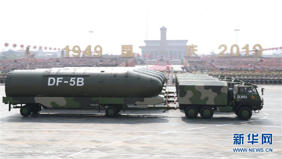 10月1日上午,庆祝中华人民共和国成立70周年大会在北京天安门广场隆重举行。这是东风-5B核导弹方队接受检阅。 新华社记者 刘彬 摄