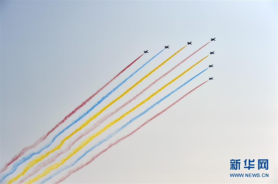 10月1日上午,庆祝中华人民共和国成立70周年大会在北京天安门广场隆重举行。这是教练机梯队。 新华社记者 周华 摄