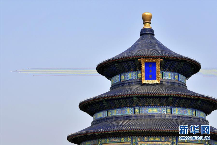 10月1日上午,庆祝中华人民共和国成立70周年大会在北京天安门广场隆重举行。 这是从天坛公园拍摄的教练机梯队。 新华社记者曹阳摄