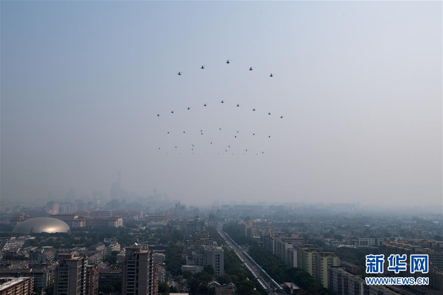 10月1日上午,庆祝中华人民共和国成立70周年大会在北京天安门广场隆重举行。这是空中护旗梯队的一架直升机。 新华社记者 韩明坤 摄