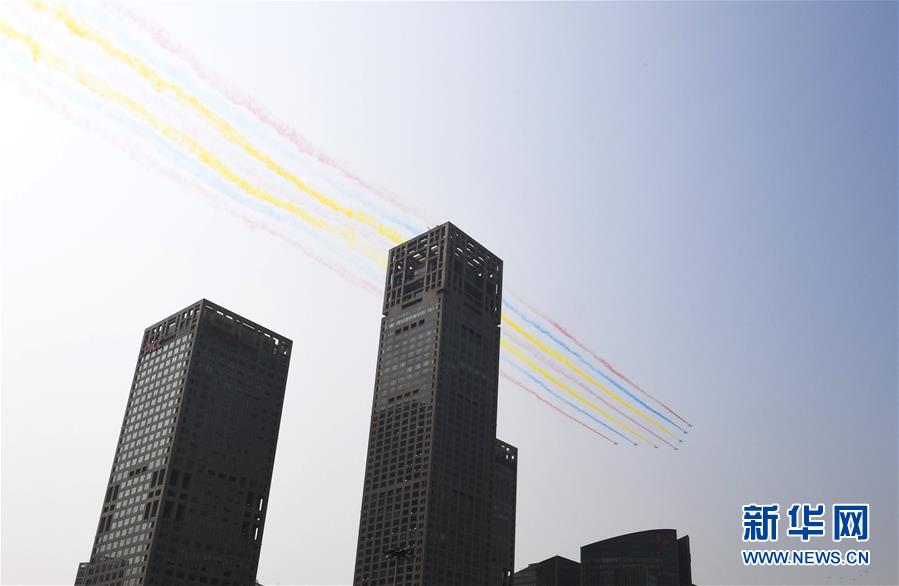 10月1日上午,庆祝中华人民共和国成立70周年大会在北京天安门广场隆重举行。这是受阅的教练机梯队。 新华社记者 邓华 摄