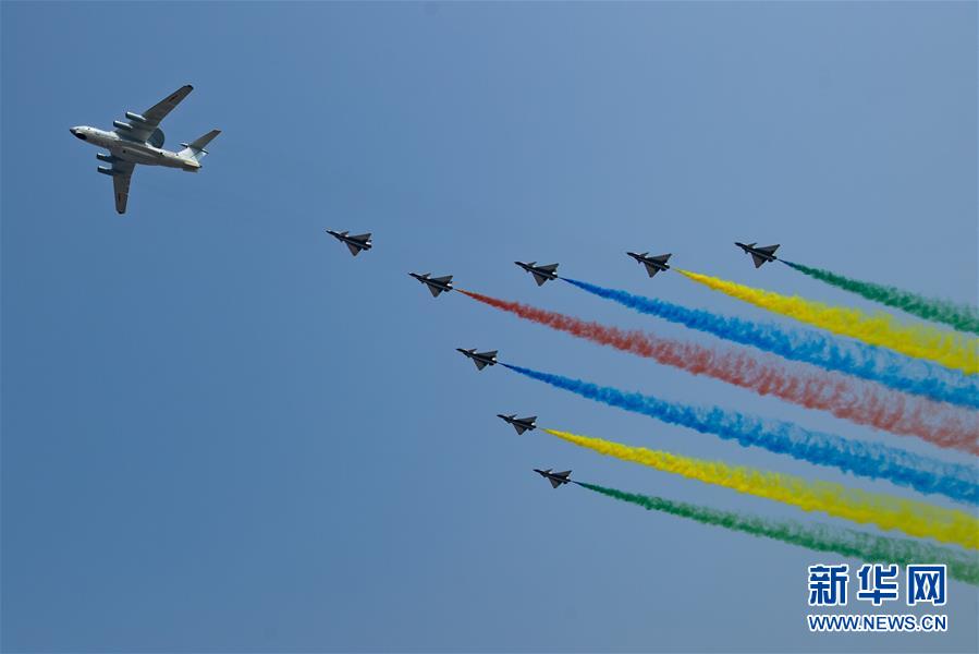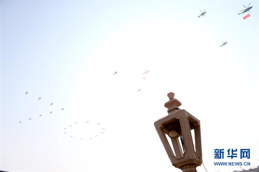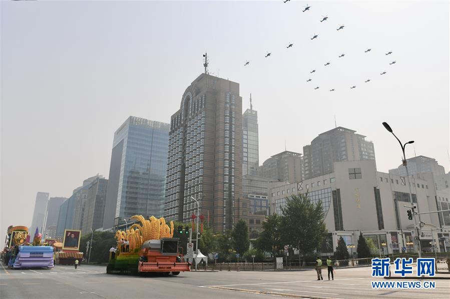 10月1日上午,庆祝中华人民共和国成立70周年大会在北京天安门广场隆重举行。这是领队机梯队。 新华社记者 刘金海 摄