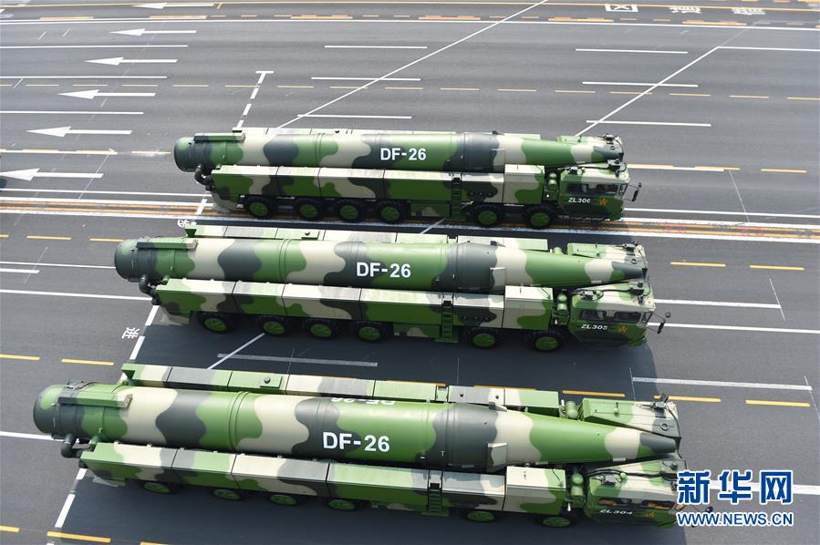10月1日上午,庆祝中华人民共和国成立70周年大会在北京天安门广场隆重举行。这是东风-26核常兼备导弹方队。 新华社记者徐昱摄