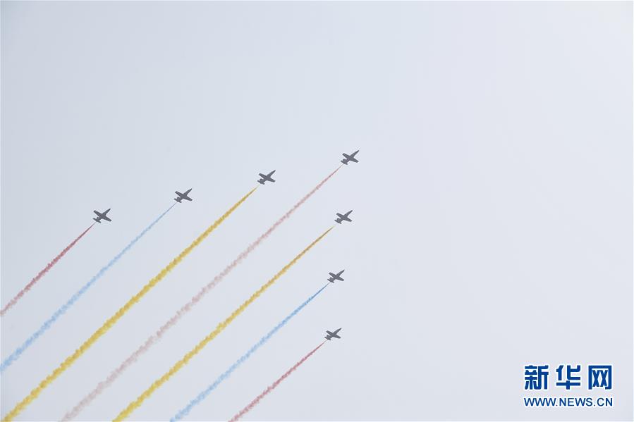 10月1日上午,庆祝中华人民共和国成立70周年大会在北京天安门广场隆重举行。 这是教练机梯队飞过天安门广场上空。 新华社记者 陈益宸 摄
