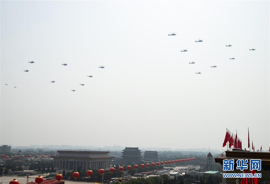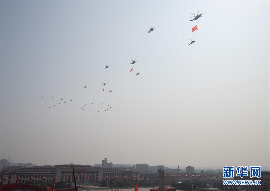 10月1日上午,庆祝中华人民共和国成立70周年大会在北京天安门广场隆重举行。 这是空中护旗方队及组成“70”字样的直升机飞过天安门广场。 新华社记者 江宏景 摄