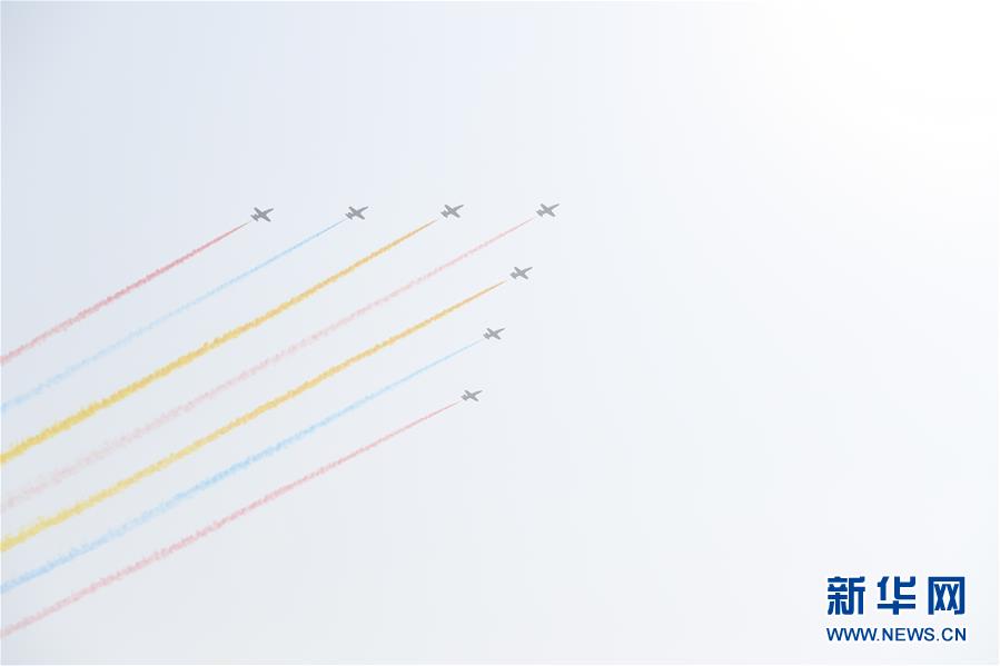 10月1日上午,庆祝中华人民共和国成立70周年大会在北京天安门广场隆重举行。这是教练机梯队。 新华社记者陈晔华摄