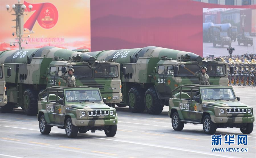 10月1日上午,庆祝中华人民共和国成立70周年大会在北京天安门广场隆重举行。这是东风-26核常兼备导弹方队。 新华社记者张晨霖摄