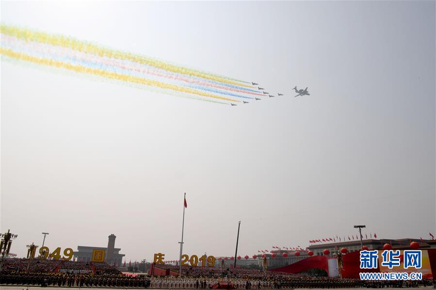 10月1日上午,庆祝中华人民共和国成立70周年大会在北京天安门广场隆重举行。这是支援保障机梯队。 新华社记者曹灿摄