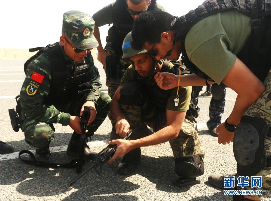 9月25日,在科威特费尔瓦尼耶省的科威特国民卫队萨穆德军营内,中国武警部队教官组成员向科威特国民卫队士兵传授射击技巧。新华社发(牛玉西 摄)