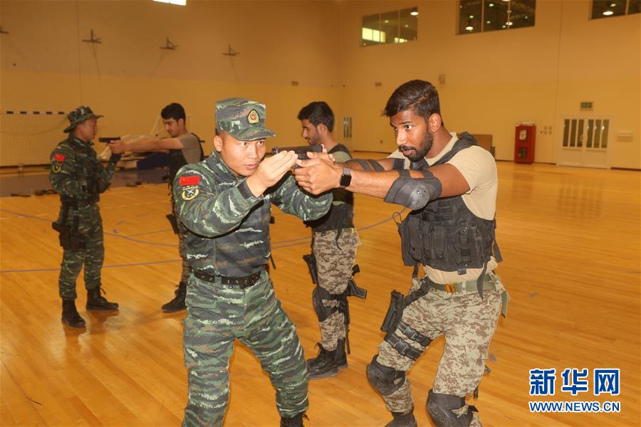 9月19日,在科威特费尔瓦尼耶省的科威特国民卫队萨穆德军营内,中国武警部队教官组成员向科威特国民卫队士兵传授射击技巧。新华社发(牛玉西 摄)