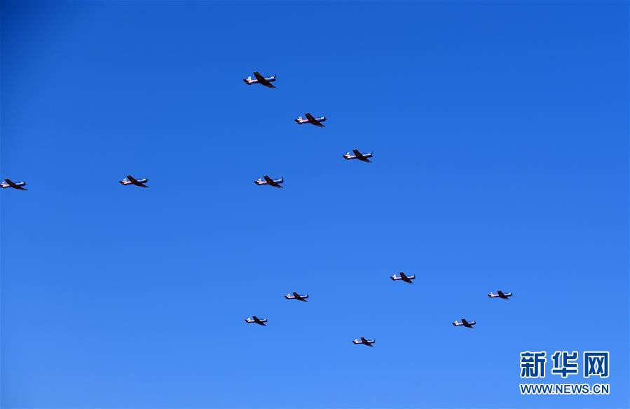 10月17日,“天之翼”飞行表演队在进行飞行表演。 当日,庆祝人民空军成立70周年航空开放活动在吉林长春开幕。空军多支飞行表演队、跳伞表演队共舞蓝天,歼-20、运-20、歼-16等多款主力战机展翅苍穹,空降兵和航空兵作战部队派出精锐力量展示作战对抗,多型武器装备大规模、全系统抵临现场。人民空军以前所未有的强大阵容亮相长春,颂扬中国航空事业110年发展成就,以开放、自信的姿态为即将到来的人民空军70华诞献上大礼。 新华社记者 林宏 摄