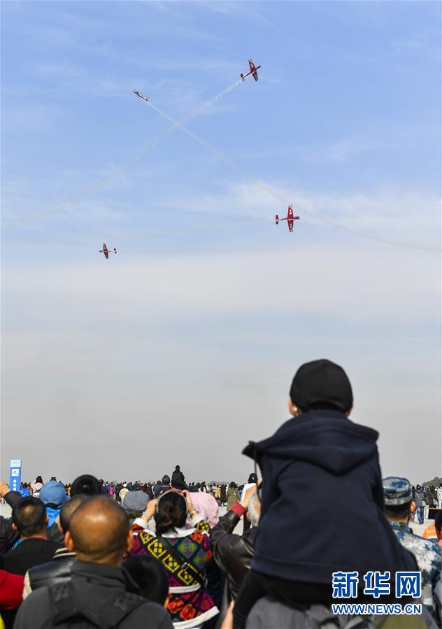 10月18日,观众在公众日上观看“天之翼”飞行表演队表演。 当日,庆祝人民空军成立70周年航空开放活动在吉林长春迎来首个公众日。 新华社记者 许畅 摄