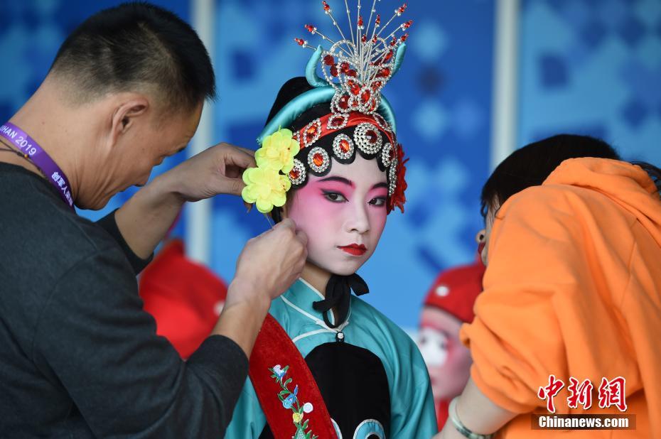 10月18日,第七届世界军人运动会即将在湖北省武汉市开幕。图为一名暖场文艺演出演员在做登台前的准备。中新社记者 侯宇 摄