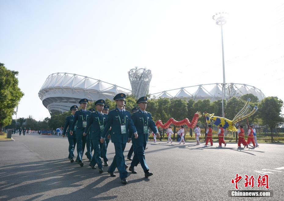 10月18日,第七届世界军人运动会即将在湖北省武汉市开幕。图为开幕式空军工作人员经过主会场——武汉体育中心。中新社记者 侯宇 摄