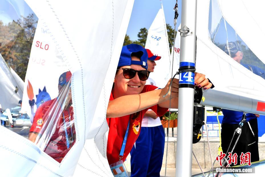 10月18日,第七届世界军人运动会帆船比赛开赛在即,运动员枕戈待旦。本届军运会帆船比赛主要包括女子470级和男女混合470级两个项目,共有来自中国、巴西、法国、西班牙等13个国家的20支代表队参赛。470级帆船是一种双人操纵的单船体竞赛帆船。比赛中,运动员要依靠自然风力作用于船帆上,在规定水域内,驾驶船只竞速前进。 中新社记者 安源 摄