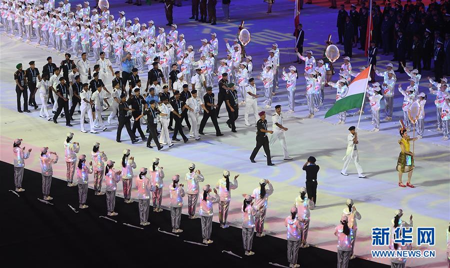 10月18日,印度代表团在开幕式上入场。 当日,第七届世界军人运动会开幕式在武汉体育中心举行。 新华社记者肖艺九摄