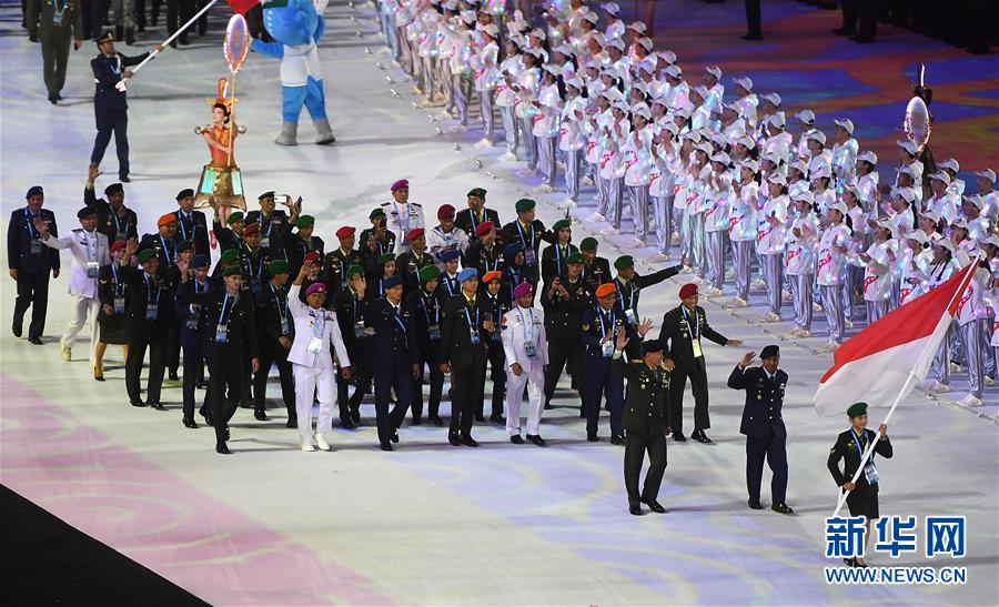 10月18日,印度尼西亚代表团在开幕式上入场。 当日,第七届世界军人运动会开幕式在武汉体育中心举行。 新华社记者肖艺九摄