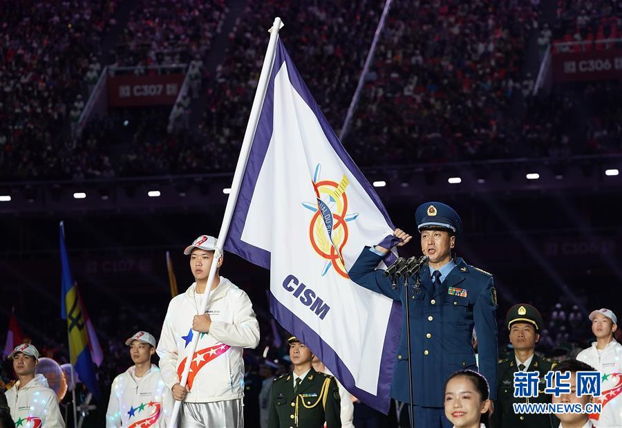 10月18日,温克明代表全体裁判员宣誓。 当日,第七届世界军人运动会开幕式在武汉体育中心举行。 新华社记者金良快摄