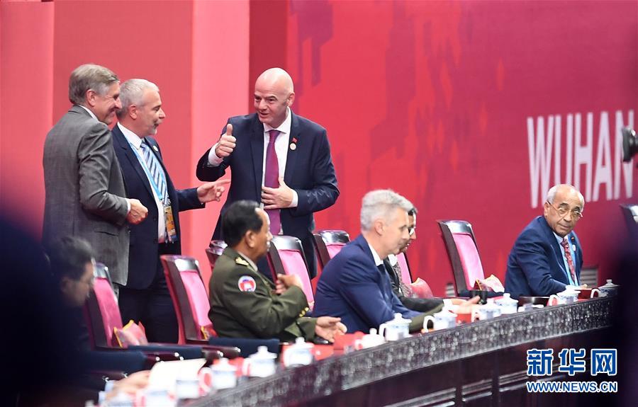 10月18日,国际足联主席因凡蒂诺(上,右)出席开幕式。 当日,第七届世界军人运动会开幕式在武汉体育中心举行。 新华社记者肖艺九摄