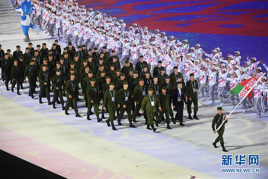10月18日,白俄罗斯代表团在开幕式上入场。 当日,第七届世界军人运动会开幕式在武汉体育中心举行。 新华社记者肖艺九摄
