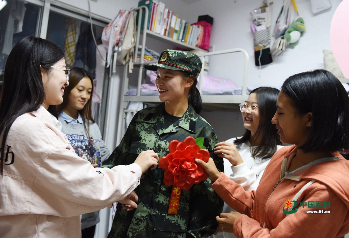 10月9日,北京,室友姐妹们帮王培艳整理新军装。徐伟 摄