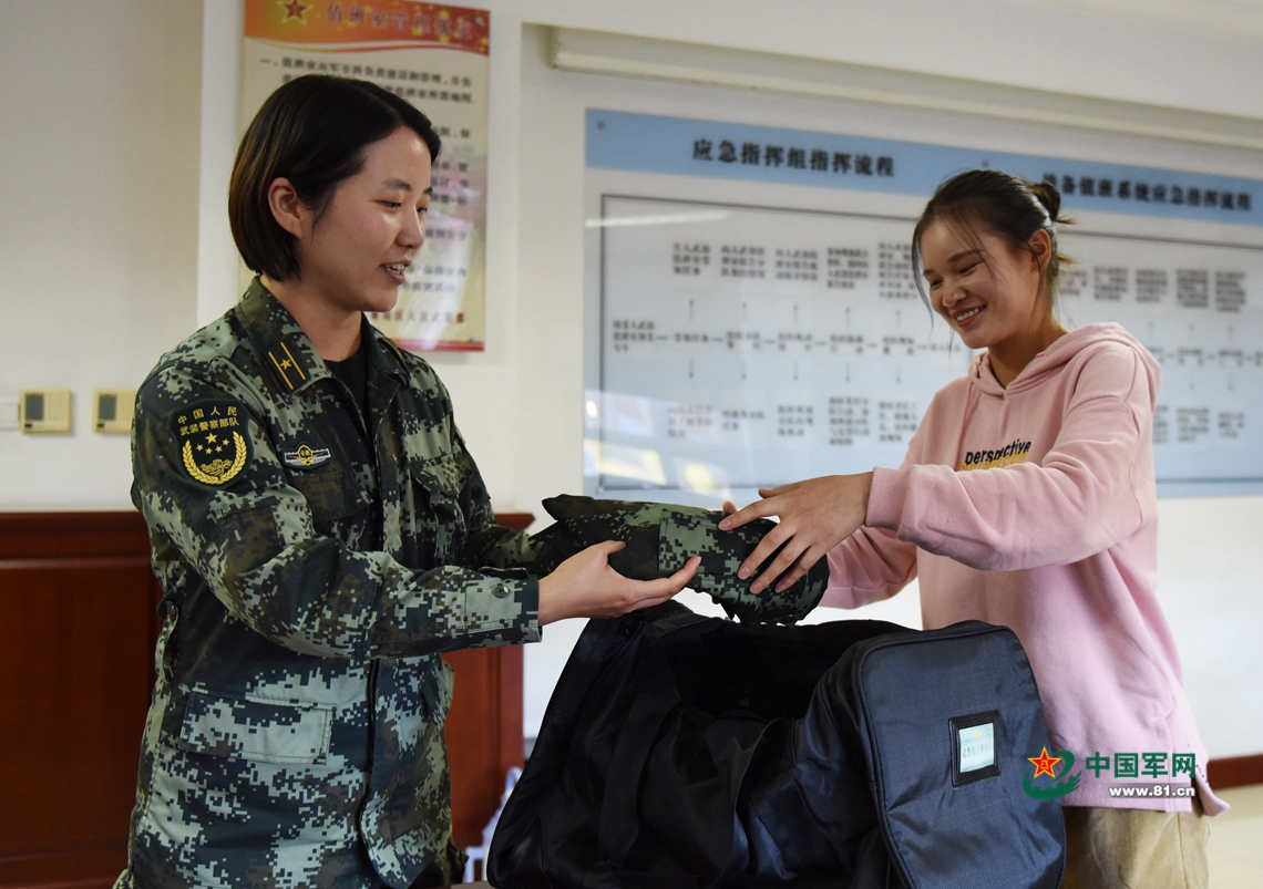 10月8日,北京,武警合肥支队领兵干部赵丹丹与王培艳一起清点新发被装。徐伟 摄