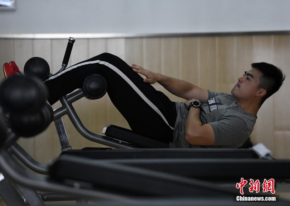 10月24日,中新社记者探访位于湖北省武汉市的第七届世界军人运动会运动员村(军运村)。各国运动员在健身中心勤练体能积极备战比赛。图为一名中国参赛运动员正在进行体能、力量训练。中新社记者 周毅 摄