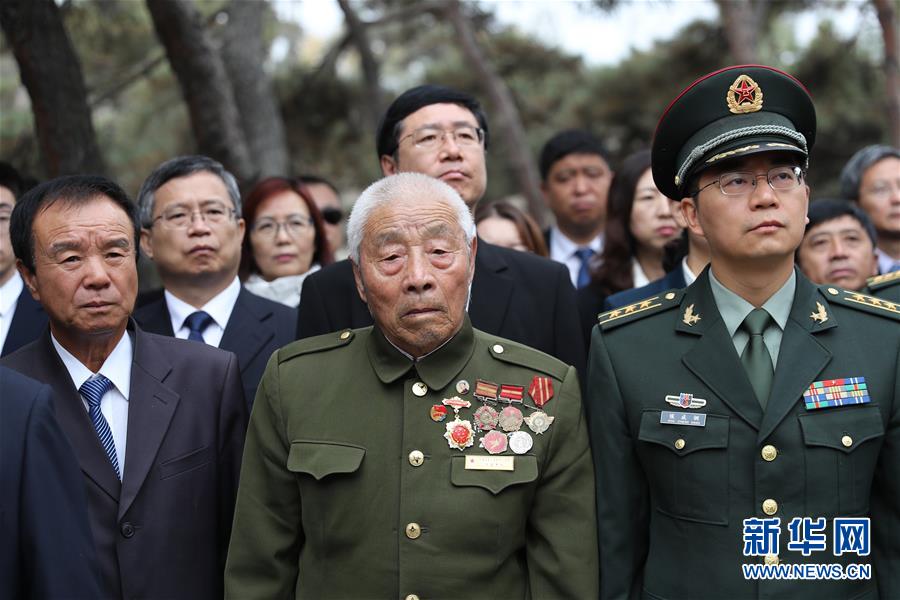 10月25日,在朝鲜平壤市兄弟山中国人民志愿军烈士陵园,一名中国人民志愿军老兵(中)参加仪式。新华社记者程大雨摄