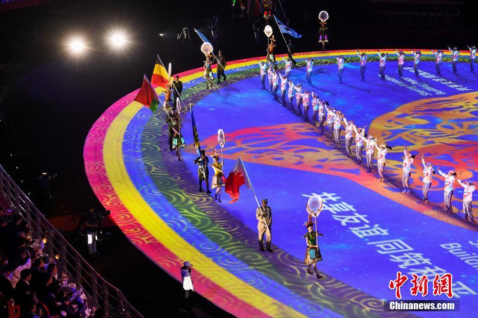 图为各参赛国国旗入场。 中新社记者 何蓬磊 摄