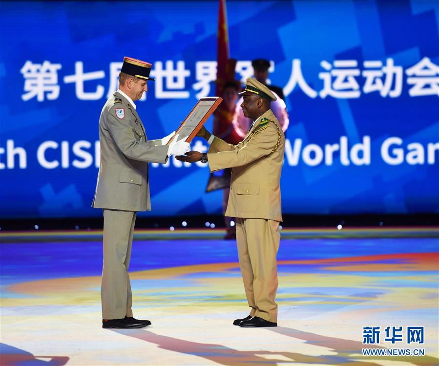 10月27日,法国代表团(左)在闭幕式上被授予公平竞赛奖。当日,第七届世界军人运动会闭幕式在武汉举行。新华社记者 熊琦 摄