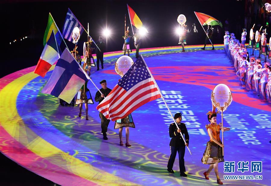 10月27日,各代表团旗手在闭幕式上入场。当日,第七届世界军人运动会闭幕式在武汉举行。新华社记者 胡虎虎 摄