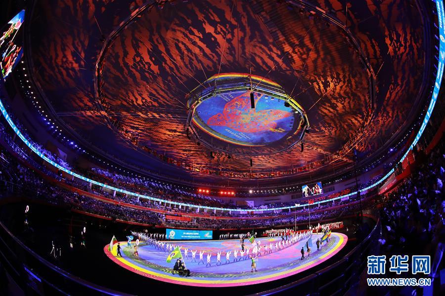 10月27日,各代表团旗手在闭幕式上入场。当日,第七届世界军人运动会闭幕式在武汉举行。新华社记者 刘续 摄