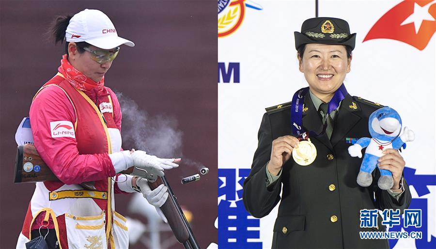中国选手陈晓瑶,在武汉进行的第七届世界军人运动会女子飞碟双向个人决赛中,获得冠军。(拼版照片)新华社发