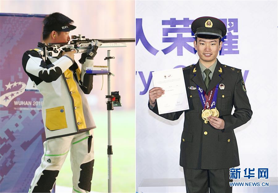 中国选手曹波,在武汉进行的第七届世界军人运动会男子300米步枪军事速射个人赛决赛中,获得冠军。(拼版照片) 新华社发